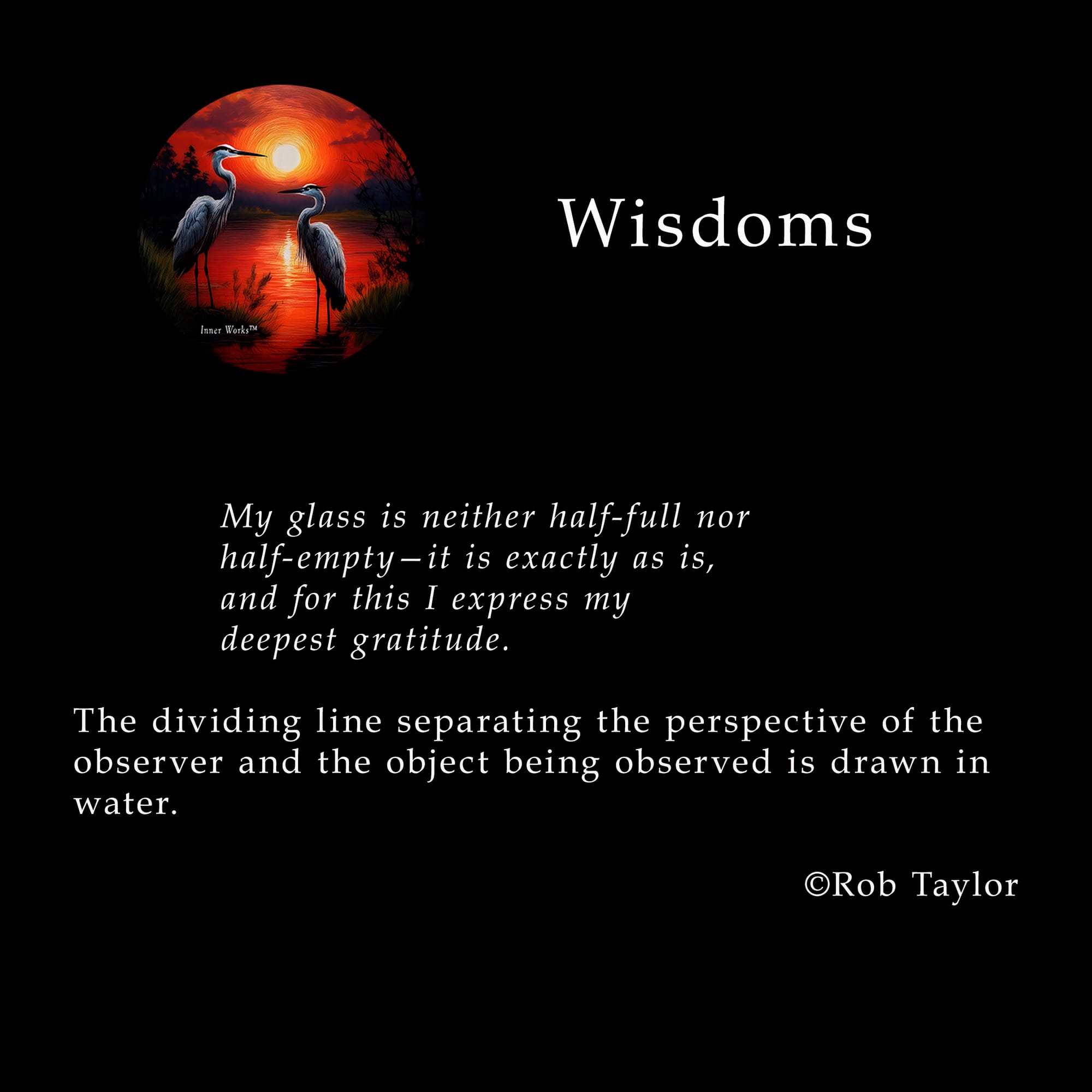 Drawn in Water The third perspective Rob Taylor March 23, 2026 – 1 min read Share this post Share this post Written by Rob Taylor Rob Taylor is a certified metaphysics and consciousness coach, practitioner, author, poet, and photographer. Explore Inner Works to learn more. "In the time-space between heartbeats, everything will change." Rob Taylor ©2025 Comments Wisdoms Breath by Breath Coming home to yourself By Rob Taylor • 1 min read Wisdoms Silence and Stillness The art of presence meditation By Rob Taylor • 1 min read Wisdoms Conditioned Resistance When assumptions meet reality By Rob Taylor • 1 min read Wisdoms Breath by Breath Coming home to yourself By Rob Taylor • 1 min read Poetry Streets Silence and absence By Rob Taylor • 1 min read Wisdoms Silence and Stillness The art of presence meditation By Rob Taylor • 1 min read Wisdoms Conditioned Resistance When assumptions meet reality By Rob Taylor • 1 min read Newsletter Membership Update Latest information By Rob Taylor • 1 min read Poetry Masterpiece Kintsugi soul poem By Rob Taylor • 1 min read