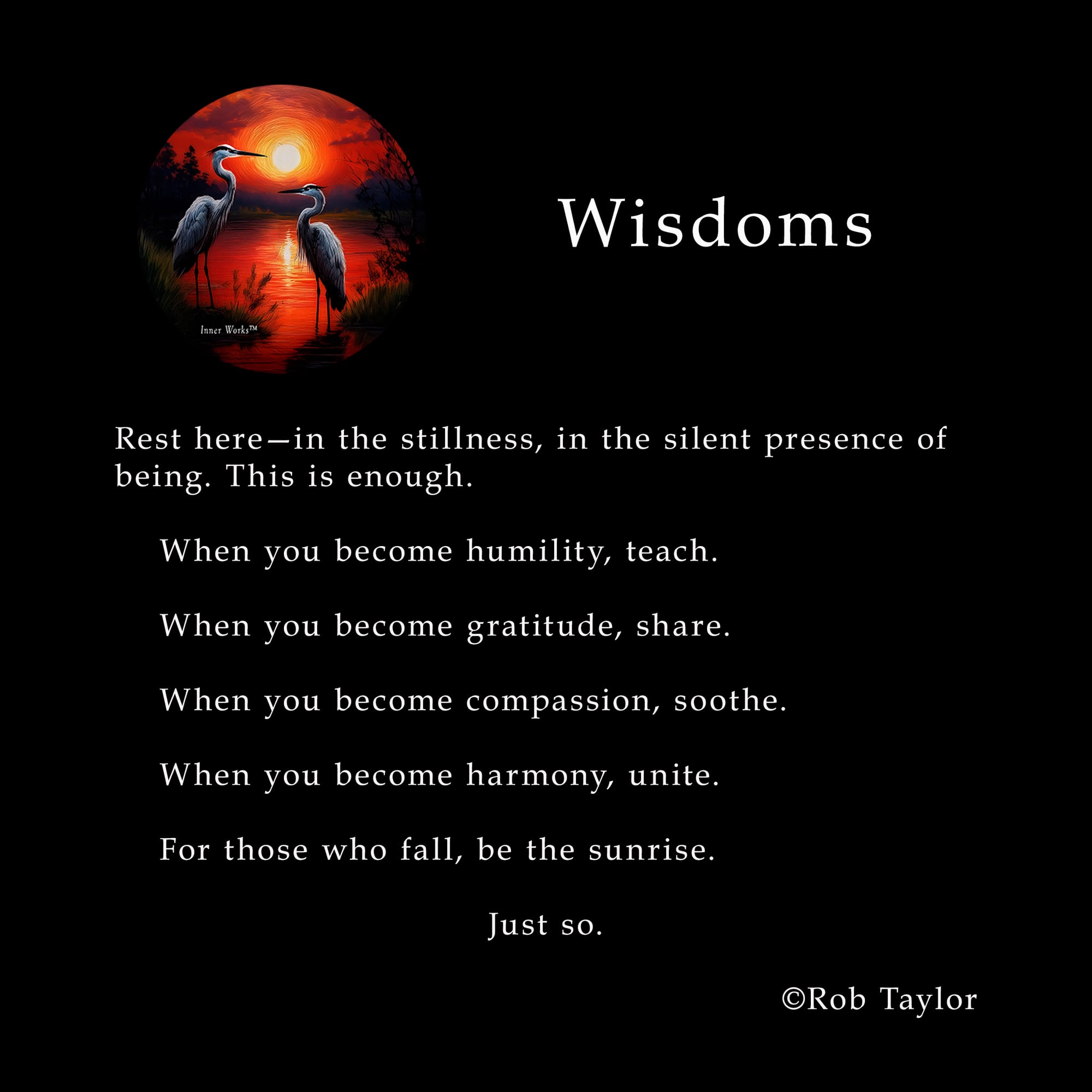 In the Stillness Beingness and presencce Rob Taylor December 15, 2025 – 1 min read Share this post Share this post Written by Rob Taylor Rob Taylor is a certified metaphysics and consciousness coach, practitioner, author, poet, and photographer. Explore Inner Works to learn more. "In the time-space between heartbeats, everything will change." Rob Taylor ©2025 Comments Wisdoms Raw Experience Sensation, perception, awareness By Rob Taylor • 1 min read Wisdoms Through the Gate Paradox of the gateless gate By Rob Taylor • 1 min read Wisdoms Liberating Discovering our oneness By Rob Taylor • 1 min read Videos Streets Street life poetry By Rob Taylor • 1 min read Wisdoms Raw Experience Sensation, perception, awareness By Rob Taylor • 1 min read Videos Purpose Love, peace & equality By Rob Taylor • 1 min read Poetry Human Machine Ecopoetry By Rob Taylor • 1 min read Wisdoms Through the Gate Paradox of the gateless gate By Rob Taylor • 1 min read Consciousness Consciousness Meditation, Part 3 Eyes wide open By Rob Taylor • 4 min read
