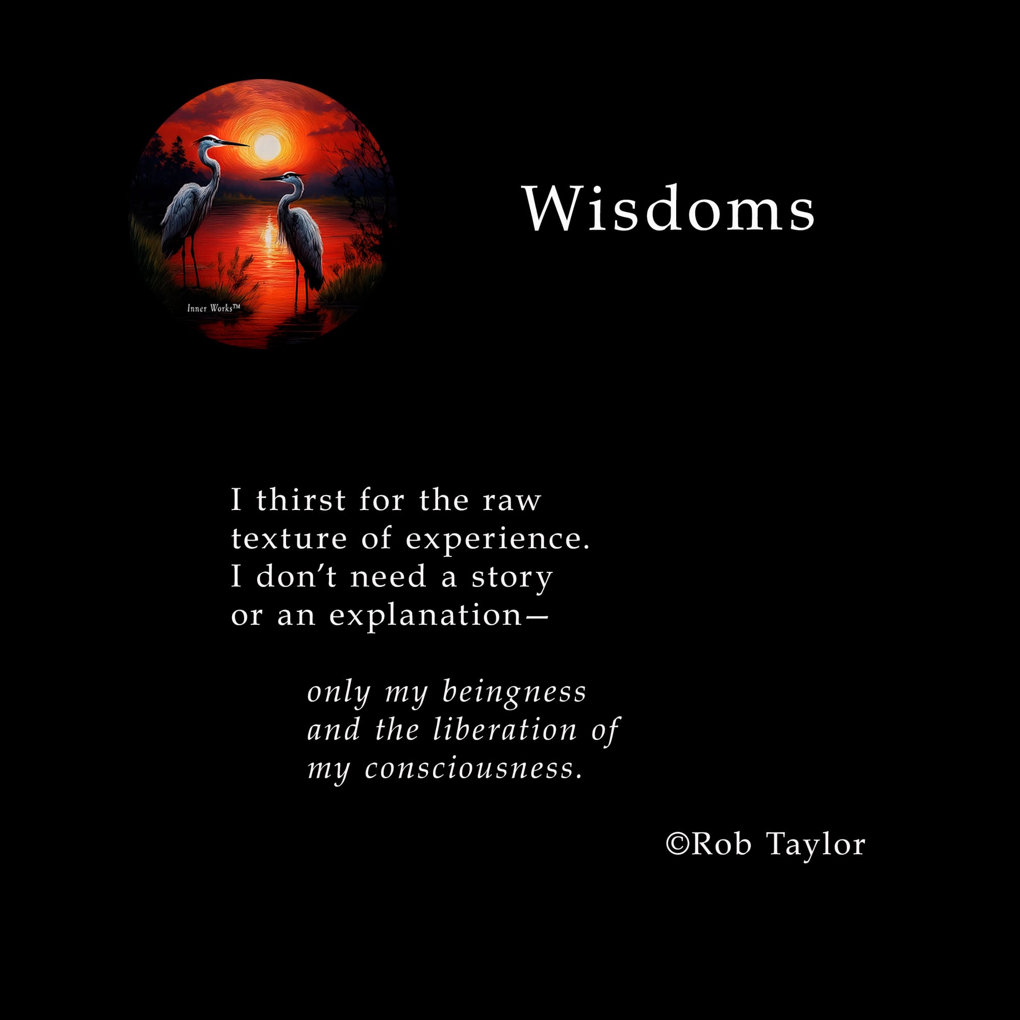Raw Experience Sensation, perception, awareness Rob Taylor January 05, 2026 – 1 min read Share this post Share this post Written by Rob Taylor Rob Taylor is a certified metaphysics and consciousness coach, practitioner, author, poet, and photographer. Explore Inner Works to learn more. "In the time-space between heartbeats, everything will change." Rob Taylor ©2025 Comments Wisdoms Through the Gate Paradox of the gateless gate By Rob Taylor • 1 min read Wisdoms Liberating Discovering our oneness By Rob Taylor • 1 min read Wisdoms In the Stillness Beingness and presencce By Rob Taylor • 1 min read Videos Streets Street life poetry By Rob Taylor • 1 min read Videos Purpose Love, peace & equality By Rob Taylor • 1 min read Poetry Human Machine Ecopoetry By Rob Taylor • 1 min read Wisdoms Through the Gate Paradox of the gateless gate By Rob Taylor • 1 min read Consciousness Consciousness Meditation, Part 3 Eyes wide open By Rob Taylor • 4 min read Wisdoms Liberating Discovering our oneness By Rob Taylor • 1 min read