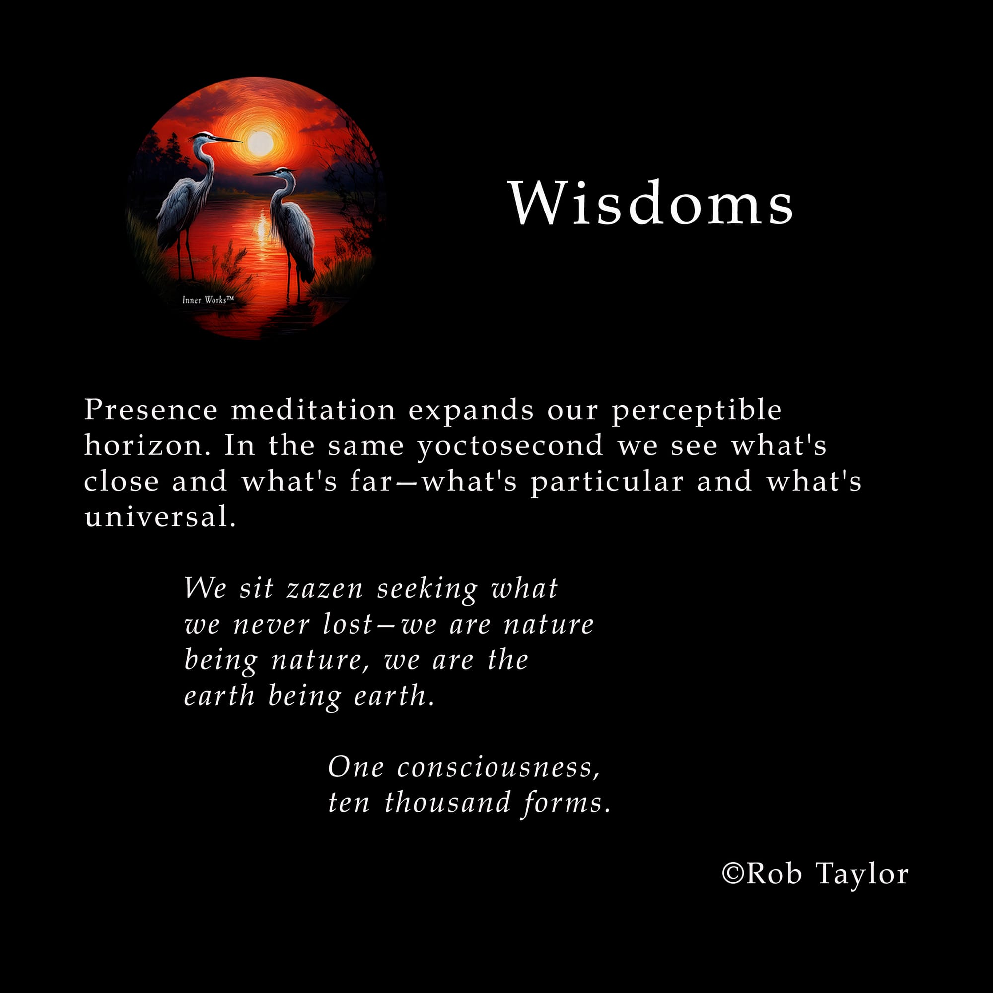 Ten Thousand Forms The non-dual horizon Rob Taylor April 13, 2026 – 1 min read Share this post Share this post Written by Rob Taylor Rob Taylor is a certified metaphysics and consciousness coach, practitioner, author, poet, and photographer. Explore Inner Works to learn more. "In the time-space between heartbeats, everything will change." Rob Taylor ©2025 Comments Wisdoms Wisdom Presence Stop trying to destroy the ego By Rob Taylor • 1 min read Wisdoms All Energy Interacts Every human emotion By Rob Taylor • Wisdoms Drawn in Water The third perspective By Rob Taylor • 1 min read Wisdoms Wisdom Presence Stop trying to destroy the ego By Rob Taylor • 1 min read Poetry Red Pain Pain as the muse By Rob Taylor • 1 min read Wisdoms All Energy Interacts Every human emotion By Rob Taylor • Consciousness Consciousness Meditation, Part 6 A continuum of energetic coherence By Rob Taylor • 5 min read Wisdoms Drawn in Water The third perspective By Rob Taylor • 1 min read Wisdoms Breath by Breath Coming home to yourself By Rob Taylor • 1 min read